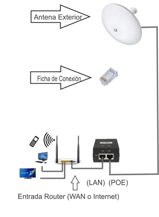 Desde el alimentador POE, la salida identificada como LAN debe conectarse al router del cliente, en la entrada marcada como WAN o Internet (según el modelo).